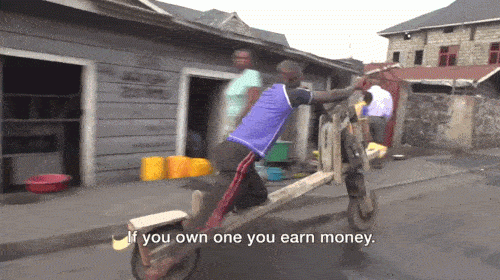 在非洲剛果的戈馬,市中心最具風(fēng)采的街景就是那些騎著木頭踏板自行車風(fēng)馳電掣的年輕人。