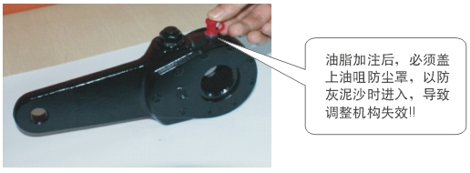 ②固定調(diào)整臂,順時針轉(zhuǎn)動調(diào)節(jié)螺母,調(diào)整臂銷孔與氣室撥叉孔自然對正。然后控制臂按控制臂上箭頭事宜方向推到極限位置。