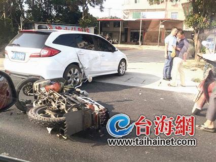 在洪塘路往同安方向的一個T字形路口,一部白色小車停在路口處,一部摩托車倒在其右后輪下。摩托車前輪輪轂變形嚴重,小車右后車門嚴重變形。