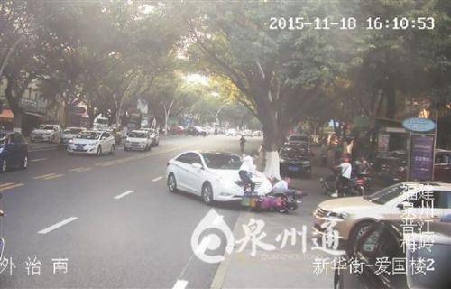 該路段的監(jiān)控顯示,事發(fā)時,王某駕車從嶺山燈控往愛國樓方向行駛,在左轉(zhuǎn)進入晉江市醫(yī)院時與摩托車相撞。但事發(fā)后,肇事小車沒有停下來,而是將摩托車連車帶人繼續(xù)往前推行,直至撞到迎面駛來的香檳色小車后才停下來。