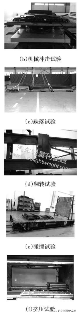 電池包的安全性能測試包括擠壓、碰撞、短路保護(hù)、濕熱循環(huán)、鹽霧以及外部火燒等多類檢測項目,但本次優(yōu)化設(shè)計僅對電池包不同結(jié)構(gòu)件的材料、厚度或幾何特征進(jìn)行了變更,并未改變電池包內(nèi)部的電氣電路、溫控系統(tǒng)和各結(jié)構(gòu)件之間的連接關(guān)系,因此,只進(jìn)行與電池包結(jié)構(gòu)性能要求相關(guān)的幾類測試,如圖9所示。