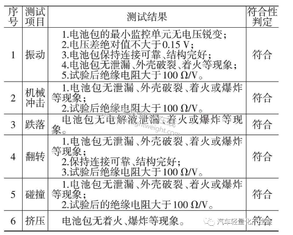 由檢測結(jié)果可知,優(yōu)化后的電池包實體在6項檢測中未出現(xiàn)起火、爆炸、電解液泄漏以及短路等問題,各項安全性能指標(biāo)均滿足國家標(biāo)準(zhǔn)要求。試驗結(jié)果表明,優(yōu)化后的電池包仍具有良好的安全性能,該優(yōu)化設(shè)計方案可行。